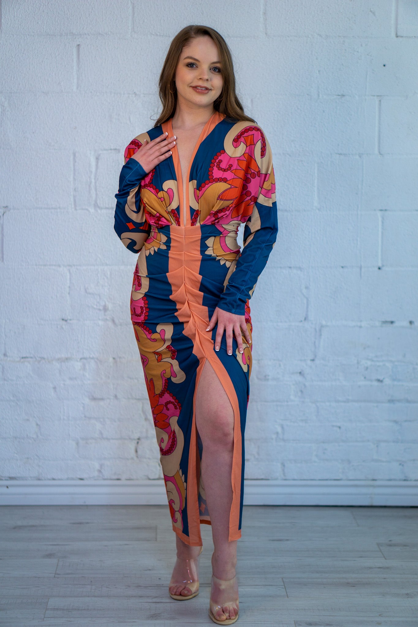 Love all things that pop, this dress features a deep V and front slit. Made with a lightweight fabric, the stretchy fit will flatter you in the best way possible. Team it up with statement earrings and heels for the grand finale of your look!