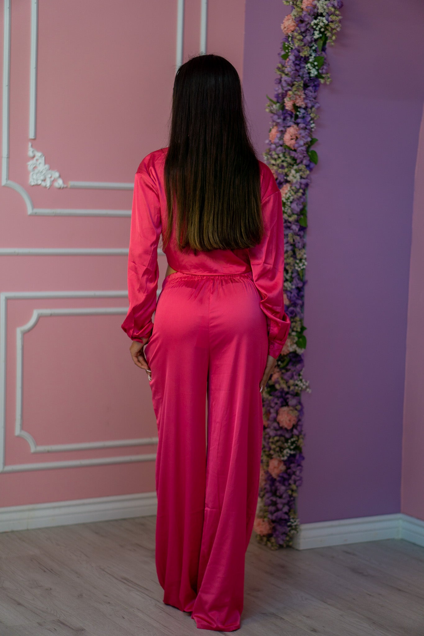 This Lizzy set features a loose fit button front top and elastic band flare pant. The set is made from a satin fabric that is both comfortable and easy to wear.